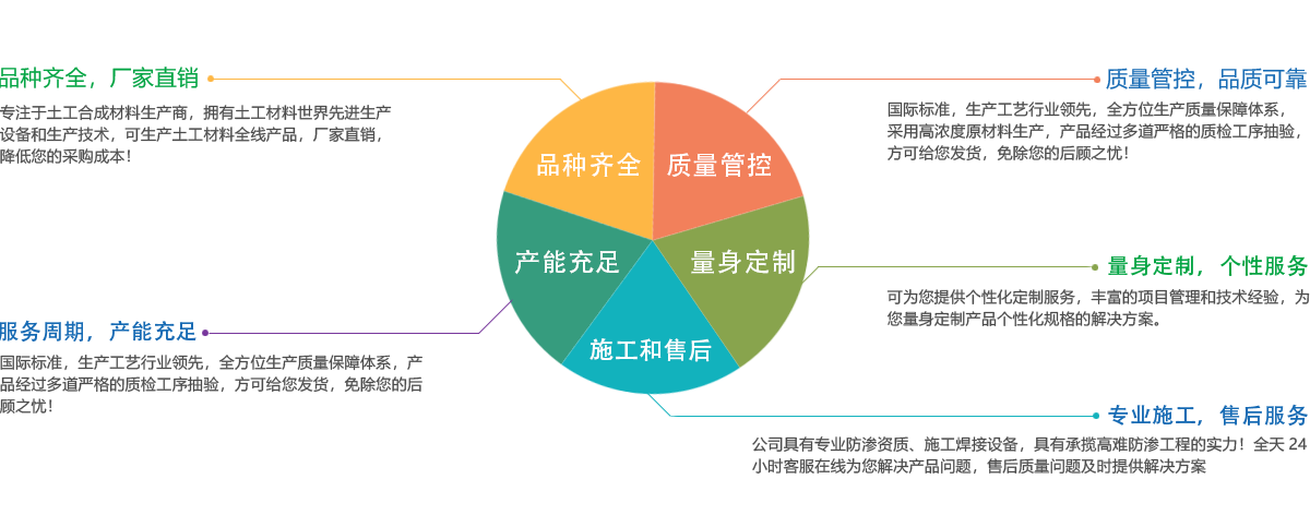 公司所有產(chǎn)品均采用國際標(biāo)準(zhǔn)組織生產(chǎn),并經(jīng)國家、市技術(shù)監(jiān)督局采標(biāo)驗(yàn)收,生產(chǎn)工藝及水平全國領(lǐng)先,屬國內(nèi)優(yōu)等水平,實(shí)物質(zhì)量達(dá)到國際先進(jìn)水平。經(jīng)用戶、施工單位使用證明,質(zhì)量穩(wěn)定可靠、施工方便、價(jià)格合理、售后服務(wù)完善。產(chǎn)品主要應(yīng)用于農(nóng)業(yè)、海綿城市建設(shè)、公路、鐵路、垃圾填埋場防滲,水利、電力、水土保持及環(huán)境綠化與基礎(chǔ)建設(shè)領(lǐng)域,已被廣泛應(yīng)用于高速公路、鐵路、垃圾填埋場等多項(xiàng)國家重點(diǎn)工程,受到工程界專家及廣大用戶的一致好評(píng)。